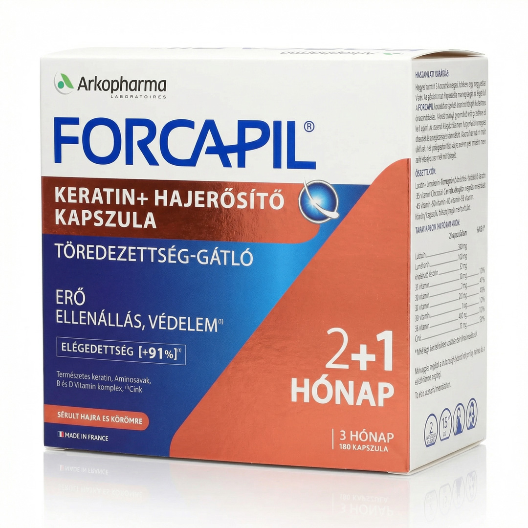 A Forcapil Keratin+ kapszula egy komplex hajerősítő étrend-kiegészítő, amelyet kifejezetten a törékeny, fénytelen vagy töredezett haj támogatására fejlesztettek. A kapszula hatóanyagai, köztük L-cisztin, L-metionin, hidrolizált keratin, biotin, cink és D-vitamin, hozzájárulhatnak a hajszálak erősítéséhez, rugalmasságához és vitalitásához – a hajgyökértől a hajvégekig.