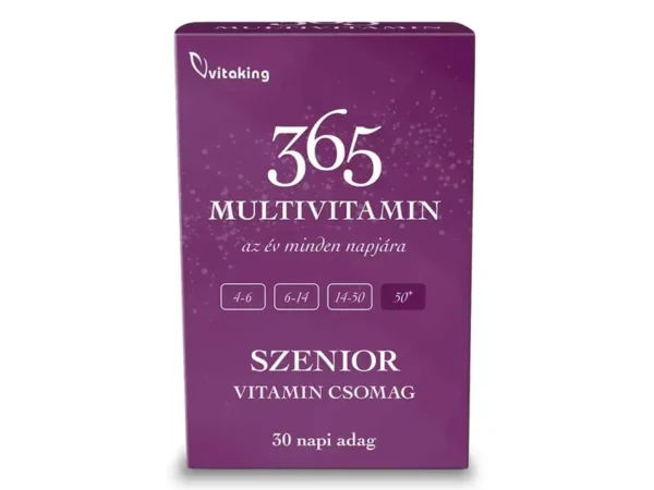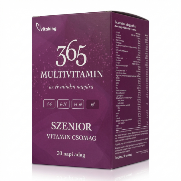 A korábban Multi Profi Senior néven ismert készítmény megújult formában, továbbfejlesztett összetétellel érhető el. A Vitaking 365 Szenior Multivitamin csomag kifejezetten az 50 év feletti korosztály tápanyagigényeihez igazított komplex formula, amely vitaminokat, ásványi anyagokat, Omega-3 zsírsavakat, Q10 koenzimet és ginkgo biloba kivonatot is tartalmaz.